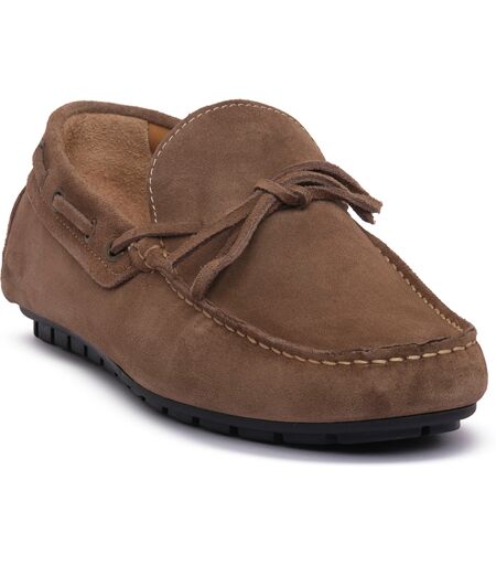 mocassino uomo con la tomaia in morbida pelle camoscio con fiocco sulla parte anteriore e laccio in pelle passante sul tallone. mocassino con suoletta interna estraibile e fondo cucito in pelle con inserti in gomma. fodera in pelle. gio damiano produ ...