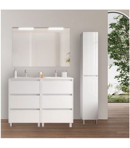 CAESAROO - Mobile bagno a terra 120 cm 6 cassetti in legno bianco lucido con lavabo ad incasso - Nova - Con specchio e doppia lampada led