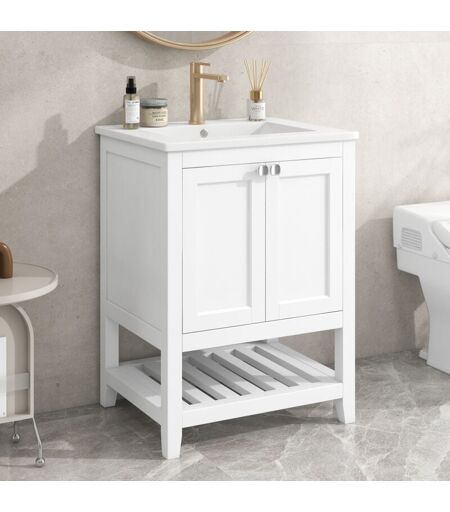 YOLEO Mobile bagno su piedini con lavabo da appoggio 61 x 46 cm - Mobile semplice 2 ripiani - Bianco