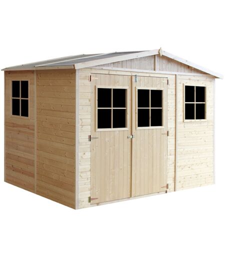 TIMBELA Casa da giardino in legno naturale A226x216x324 cm/6 m²- Magazzino esterno con finestre - Capanno da giardino - Bici, Deposito attrezzi e rimessa