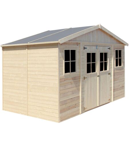 TIMBELA Casa da giardino in legno naturale con pavimento impregnato A246x418x220 cm/8 m²- Magazzino esterno con finestre - Capanno da giardino - Bici,