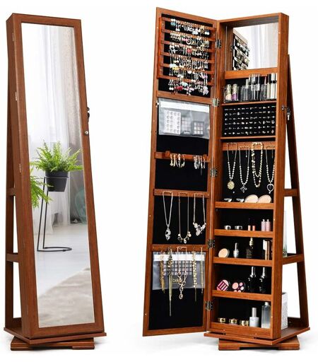 COSTWAY Armoire à Bijoux Pivotante à 360 Degrés, avec Grand Miroir Psyché et Etagère de Rangement à L'Arrière Marron -
