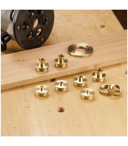 Kit di 7 boccole guida Un pratico kit in ottone di 7 boccole guida che vi permetterà di sfruttare al massimo la vostra elettrofresatrice. Da utilizzare per operazioni con dima per fresature a coda di rondine, fresature per gradini, per cerniere, per serrature, ecc. Le boccole possono essere utilizzate con qualsiasi elettrofresatrice con una base il cui foro misuri 30mm. Da utilizzare sulle fresatrici più popolari. ...