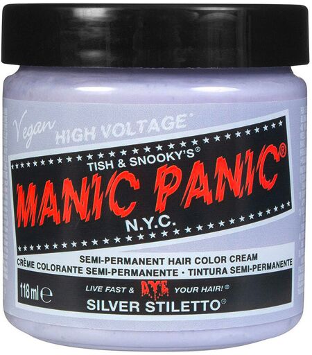 La tinta per capelli semipermanente High Voltage Classic di Manic Panic comprende una varietà di tonalità vivaci. Gli ingredienti di alta qualità utilizzati garantiscono un risultato cromatico di alta qualità. Gli ingredienti nutrienti della formula condizionano i capelli durante la colorazione e assicurano una finitura setosa e brillante e una sensazione di morbidezza al tatto. Silver Stiletto è una tinta per capelli color argento gelido e lavanda che agisce come tonalizzante per creare capelli luminosi e color platino eliminando i toni gialli. Quando Silver Stiletto viene applicato su capelli già tonalizzati e pre-chiariti di livello 10 o superiore, crea splendidi colori grigio chiaro. Silver Stiletto può anche essere miscelato con la vostra tinta semipermanente preferita di Manic Panic per creare tonalità pastello gelide. Caratteristiche importanti: Livello di capelli richiesto: 10 o superioreIntensità: LeggeraDurata del colore: BassaReattivo ai raggi UV: No Le tinte per capelli Manic Panic sono pronte all'uso e non necessitano di sviluppatore. Vegan e cruelty freePrive di: PPD, parabeni, ammoniaca, resorcinolo, ftalati e glutine.Circa 4 - 6 settimane di colore a lunga durataSvanisce gradualmente a ogni lavaggio dei capelliLe tonalità di colore possono essere mescolate tra loroPuò essere combinato con il Pastel-izer per creare tonalità pastello morbide e di tendenza8 tonalità di colore reattive ai raggi UV che si illuminano alla luce neraPronto all'uso, non richiede sviluppatoreRisultati migliori con capelli già schiaritiProdotto negli Stati Uniti Quanti barattoli da 118 ml mi servono per i miei capelli? Capelli corti e lunghi: 1 - 2 barattoli, a seconda dello spessore dei capelli. Capelli lunghi dalle spalle alla vita: 2 - 3 dosi, a seconda dello spessore dei capelli. Per i capelli spessi, può essere necessaria una bomboletta aggiuntiva per le punte. Capelli lunghi fino alla vita: più di 3 dosi, a seconda dello spessore dei capelli. Applicazione: 1. lavare i capelli con uno shampoo detergente profondo, senza usare il balsamo.2. asciugare i capelli con il phon per assicurarsi che i capelli siano estremamente porosi.3. indossare i guanti e applicare la tinta ciocca per ciocca con un pennello da colorazione. Assicurarsi che ogni ciocca di capelli sia coperta da una quantità sufficiente di colore per evitare un risultato disomogeneo.4 Quindi pettinare i capelli per assicurarsi che il colore sia distribuito in modo uniforme. La crema colorante può diventare leggermente schiumosa.5. coprire i capelli con una cuffia di plastica e lasciare agire il colore per 30-45 minuti. Per una maggiore intensità, lasciare in posa sotto una fonte di calore.6. risciacquare i capelli con acqua fredda finché l'acqua non diventa trasparente. Evitare il contatto con il viso e il corpo. Non fare lo shampoo.7. acconciare i capelli come desiderato. Per evitare il trasferimento del colore, assicurarsi sempre che i capelli siano completamente asciutti. Avvertenze: Solo per... ...