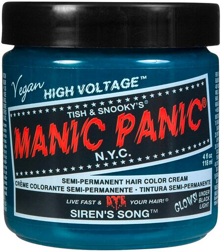 La tinta per capelli semipermanente High Voltage Classic di Manic Panic comprende una varietà di tonalità vivaci. Gli ingredienti di alta qualità utilizzati garantiscono un risultato cromatico di alta qualità. Gli ingredienti nutrienti della formula condizionano i capelli durante la colorazione e assicurano una finitura setosa e brillante e una sensazione di morbidezza al tatto. Siren's Song è una tinta neon blu-verde. Per ottenere risultati ottimali, si consiglia di schiarire i capelli a un livello di biondo 10 o inferiore. Caratteristiche importanti: Livello di capelli richiesto: 10 o superioreIntensità: ModerataDurata del colore: ModerataReattivo ai raggi UV: Sì Le tinte per capelli Manic Panic sono pronte all'uso e non necessitano di sviluppatore. Vegan e cruelty freePrive di: PPD, parabeni, ammoniaca, resorcinolo, ftalati e glutine.Circa 4 - 6 settimane di colore a lunga durataSvanisce gradualmente a ogni lavaggio dei capelliLe tonalità di colore possono essere mescolate tra loroPuò essere combinato con il Pastel-izer per creare tonalità pastello morbide e di tendenza8 tonalità di colore reattive ai raggi UV che si illuminano alla luce neraPronto all'uso, non richiede sviluppatoreRisultati migliori con capelli già schiaritiProdotto negli Stati Uniti Quanti barattoli da 118 ml mi servono per i miei capelli? Capelli corti e lunghi: 1 - 2 barattoli, a seconda dello spessore dei capelli. Capelli lunghi dalle spalle alla vita: 2 - 3 dosi, a seconda dello spessore dei capelli. Per i capelli spessi, può essere necessaria una bomboletta aggiuntiva per le punte. Capelli lunghi fino alla vita: più di 3 dosi, a seconda dello spessore dei capelli. Applicazione: 1. lavare i capelli con uno shampoo detergente profondo, senza usare il balsamo.2. asciugare i capelli con il phon per assicurarsi che i capelli siano estremamente porosi.3. indossare i guanti e applicare la tinta ciocca per ciocca con un pennello da colorazione. Assicurarsi che ogni ciocca di capelli sia coperta da una quantità sufficiente di colore per evitare un risultato disomogeneo.4 Quindi pettinare i capelli per assicurarsi che il colore sia distribuito in modo uniforme. La crema colorante può diventare leggermente schiumosa.5. coprire i capelli con una cuffia di plastica e lasciare agire il colore per 30-45 minuti. Per una maggiore intensità, lasciare in posa sotto una fonte di calore.6. risciacquare i capelli con acqua fredda finché l'acqua non diventa trasparente. Evitare il contatto con il viso e il corpo. Non fare lo shampoo.7. acconciare i capelli come desiderato. Per evitare il trasferimento del colore, assicurarsi sempre che i capelli siano completamente asciutti. Avvertenze: Solo per uso esterno. Tenere fuori dalla portata dei bambini. Utilizzare solo come indicato. Questo prodotto contiene ingredienti che possono causare irritazioni cutanee in alcuni individui; pertanto, è necessario effettuare prima un test preliminare secondo le istruzioni allegate. Non utilizzare il prodotto... ...