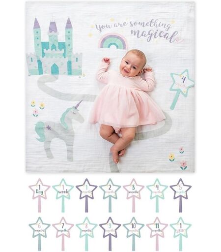 Questo kit di Lulujo include 1 copertina swaddle e 14 cartoline; unidea originale e frizzante per i genitori e i bebe piu social! Utilizza la copertina swaddle come sfondo per fotografare il tuo piccolo durante il suo primo anno di vita: distendi il bebe sulla copertina, inserisci la cartolina giusta nello scatto - 1 mese, 3 mesi, 6 mesi ecc. - aggiungi qualche giocattolo o altro oggetto che personalizzi la posa e carica la foto sui tuoi social network! La copertina e ideale per mille altri usi, misura 100 x 100 cm ed e realizzata in pura mussola di cotone 100%. Lavabile in lavatrice a 40°, diventa piu morbida ad ogni lavaggio. ...