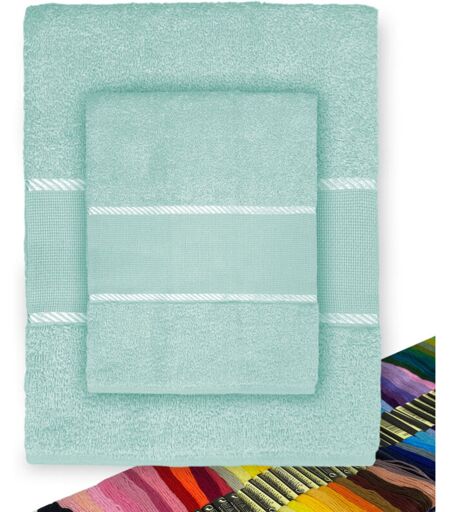 Il set è composto da 1 asciugamano e da 1 ospite in spugna tinta unita di cotone 100% di buona consistenza dotati di tela aida da ricamare a punto croce. Sono di produzione italiana, ideali per l'uso quotidiano perchè asciugano veramente bene e sono confezionati in busta. • L'asciugamano misura cm. 60x100 ed ha la balza in tela aida alta 10 cm. • L'ospite misura cm. 40x60 ed ha la balza in tela aida alta cm. 7,50 • All'interno della confezione sono presenti 6 matassine di filato originali ' GINA LA MATASSINA ' per ricamare assortite a sorpresa. Sono disponibili in diversi colori, ottimi come idea regalo o per uso personale. ...