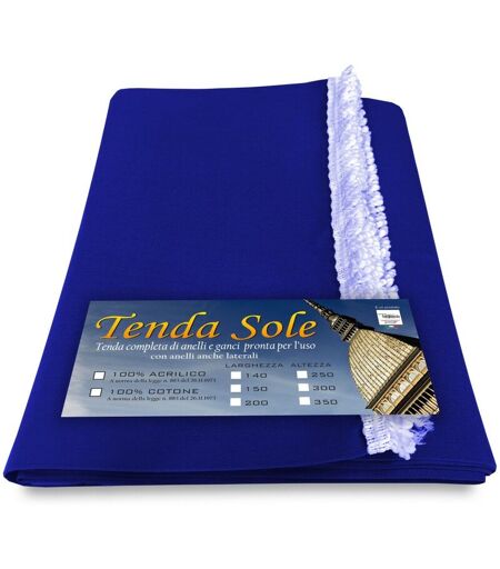 Tenda sole 'tinta unita blu' confezionata già pronta per l'uso realizzata in tessuto indistruttibile di acrilico. Rifinita nella parte superiore con puntina e occhielli in acciaio mentre nei lati orlo semplice e nella parte inferiore frangia abbinata. È dotata di ganci in plastica che agganciati agli occhielli in acciaio della tenda gli permettono di essere montata su qualsiasi tipo di bastone. Gli anelli in plastica hanno un diametro di 16 mm, mentre quelli in acciaio dove si agganceranno quelli in plastica hanno un diametro di 9 mm. La tenda non è stampata, come nel caso delle tende da sole economiche, ma il tessuto è costruito a telaio in tinto filo. È in tessuto acrilico che resiste ad alte temperature ed ha una durata di parecchi anni. -tessuto..................................................acrilico -funzione tessuto...................................coprente -composizione tessuto.......................100% acrilico -finitura superiore........................occhielli in ...
