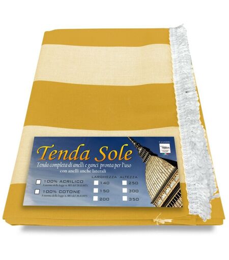 Tenda sole 'riga larga gialla' confezionata già pronta per l'uso realizzata in tessuto indistruttibile di acrilico. Rifinita nella parte superiore con puntina e occhielli in acciaio mentre nei lati orlo semplice e nella parte inferiore frangia abbinata. È dotata di ganci in plastica che agganciati agli occhielli in acciaio della tenda gli permettono di essere montata su qualsiasi tipo di bastone. Gli anelli in plastica hanno un diametro di 16 mm, mentre quelli in acciaio dove si agganceranno quelli in plastica hanno un diametro di 9 mm. La tenda non è stampata, come nel caso delle tende da sole economiche, ma le righe sono costruite a telaio in tinto filo. È in tessuto acrilico che resiste ad alte temperature ed ha una durata di parecchi anni. -tessuto..................................................acrilico -funzione tessuto...................................coprente -composizione tessuto.......................100% acrilico -finitura superiore........................occhielli in ...