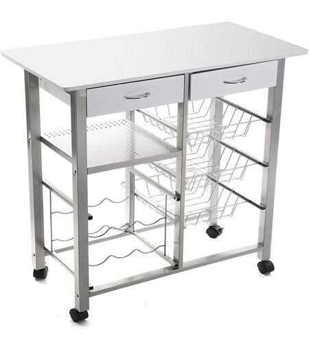 COSE DA CASA Carrello da Cucina bianco in Legno e Acciaio Piano di Lavoro 76x40 2 Cassetti 3 Cestini Porta Frutta Cantinetta 6 porta bottiglie e 4 Ruote