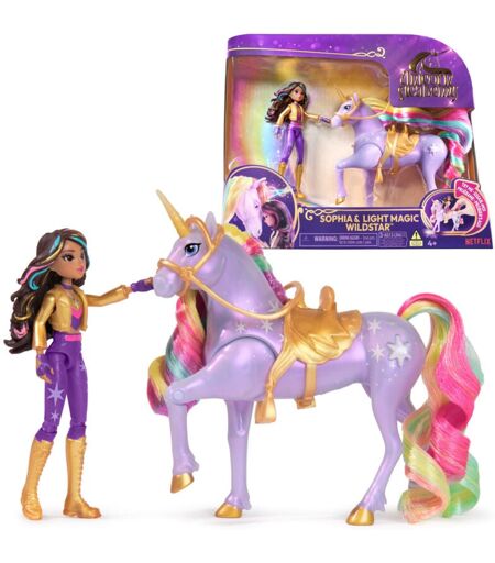 Scopri la magia di Unicorn Academy con Sophia & Light Magic Wildstar. Ispirato alla serie animata di NETFLIX e ai libri di grande successo in cui regna l'amicizia, questo duo celebra il legame speciale tra rider e unicorno. Con dettagli fedeli al cartone, la morbida criniera, la coda arcobaleno e gli effetti luminosi autentici di Wildstar, questo set ti permetterà di rivivere le avventure della serie TV. Con 7 punti articolati, puoi posizionare Sophia in groppa a Wildstar e premere il pulsante contrassegnato da una stella sul lato dell'unicorno per attivare le luci (3 pile LR44 incluse) mentre ricrei le tue scene preferite. Wildstar batte lo zoccolo, usando la Magia della luce per proiettare l’arcobaleno, proprio come nel cartone. Sophia rimane saldamente in posizione su Wildstar con la briglia e la sella rimovibili. Per creare altre avventure con i tuoi personaggi preferiti di Unicorn Academy, cerca le altre bamboline, tra cui Ava, Layla, Isabel e Valentina, e i loro unicorni (set ...
