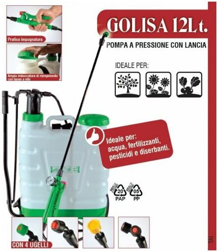 Pompa a pressione a zaino per uso in spalla con irroratore Golisa 12 Lt . Caratteristiche : Pratica e utile pompa a zaino ideale per acqua, fertilizzanti, pesticidi , diserbanti ma anche per disinfestazione. Il suo uso è molto pratico grazie alle bratelle che permettono di portalla a spalla. Estremamente leggera ( peso a vuoto solo 2.8 kg) ma robusta allo stesso tempo. Serbatoio da 12 litri a pieno carico. Filtro nel collo del serbatoio rimovibile e lavabile. Materiale PVC resistente. Lancia con tubo e pressometro ( 6 bar) . 4 diversi ugelli in dotazione : a cono, a ventaglio, doppio cono e a 4 fori . Colore bianco e verde. Cinta regolabile con imbottitura spalle di colore nero. Si può utilizzare in orto, giardino, vivaio ecc.. Guarnzioni di ricambio incluse nella scatola. Differenze ugelli : Eroratore base: monospruzzo con ampiezza regolabile. Eroratore a ventaglio: ideale per le colture basse e per l'irrorazione di diserbanti a brevi distanze. Eroratore conico: ideale per ...