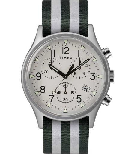 Orologio Cronografo Da Uomo Di Timex Della Collezione Mk1 Aluminum Chrono. Orologio Con Cassa Della Misura Di 40 Mm In Alluminio E Quadrante Di Colore Argento Con Indici Numerici. Modello Con Cinturino Reversibile A Righedi Colore Verde Oliva E ...