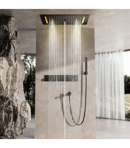 Bathroom System Overview: The whole body is made of brass, which is corrosion resistant and ensures durability and long service life. The system includes a 700×380mm shower head, shower head and drain hose, offering different water flow experiences to meet your shower needs and help you relax. Shower head: 700×380mm shower head equipped with five water discharge modes. Rain Mode: Mimics the feeling of raindrops; Waterfall Mode: Provides a large and powerful water flow; Water column mode: provides concentrated and powerful water flow; Spray mode: provides a gentle mist-like water flow; Mode to bring variety Optimal shower experience. Thermostatic technology: The smart shower system is equipped with a safety thermostatic valve at 38°C. This function can keep the water temperature stable, eliminating the need for frequent temperature adjustments, reducing the risk of burns caused by sudden changes in hot and cold water pressure, and providing a safer, quieter and more pleasant shower ...