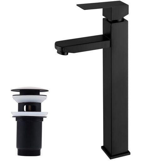 HOMELODY - Rubinetto del lavabo nero con tappo per lavabo, miscelatore per lavabo in acciaio inox e tappo con troppopieno automatico