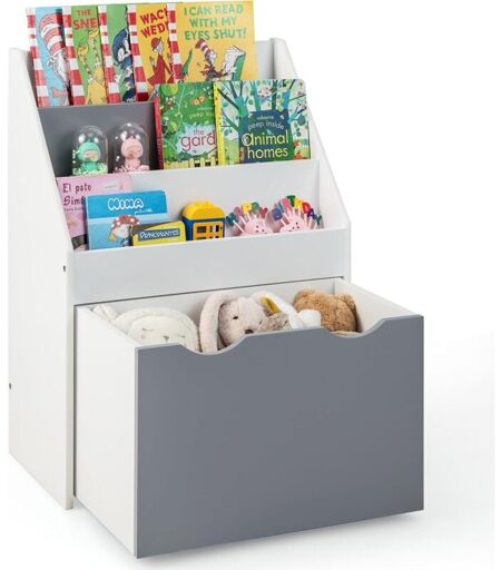 COSTWAY - Scaffale per Bambini con 3 Ripiani e Scatola di Giocattoli, Libreria per Bambini e Bambine per Stanza dei Giochi, Soggiorno e Asilo, Grigio