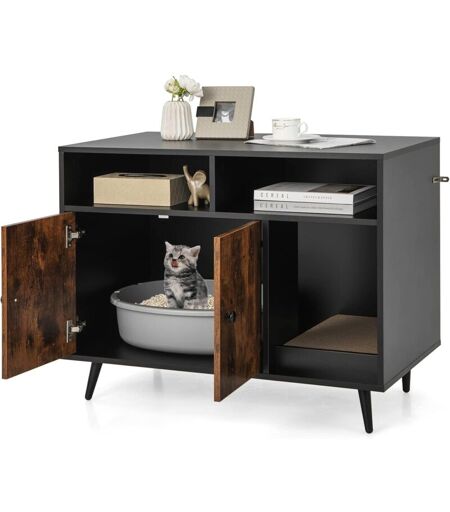 COSTWAY Mobile per Lettiera Gatti con Tira graffi, Gambe Inclinate in Metallo e 2 Ripiani per Riporre gli Oggetti, Casetta in Legno da Interno per