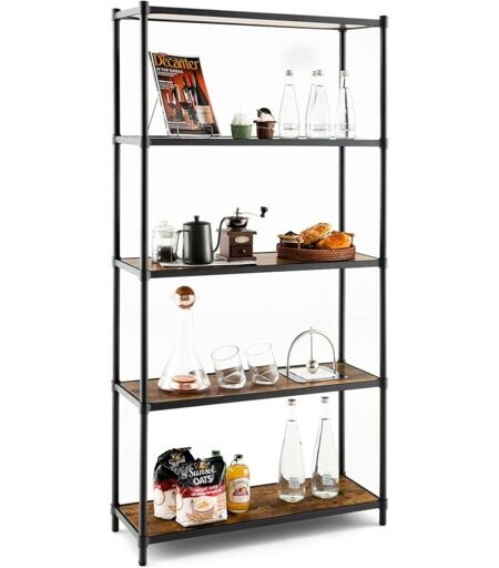 Informazioni su questo articolo # Scaffali di stoccaggio aperti # Questo scaffale organizzatore a 5 livelli offre un’ampia capacità di stoccaggio per riporre una varietà di oggetto. L’ampio spazio di 34,5 cm per ogni livello consente di riporvi anche gli oggetti più alti. Questo portaoggetti manterrà la vostra casa pulita e ordinata. # Stile semplice e moderno # La delicata superficie con venature del legno si sposa bene con la struttura in metallo, conferendo all’unità di scaffalatura un aspetto elegante. Questo scaffale a 5 livelli è un ottimo spazio organizzativo e decorativo per il soggiorno, la camera da letto, la lavanderia o l’ufficio. # Struttura resistente e robusta # Realizzata in legno di alta qualità e struttura in metallo, questa libreria a scaffale indipendente è molto robusta e durevole. La superficie dei ripiani è resistente, antigraffio e facile da pulire. Ogni ripiano aperto può sostenere fino a 20kg e il peso massimo è di 100kg (uniformemente distribuito). # ...