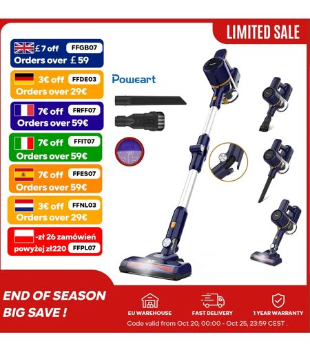 POWEART N7P Aspirapolvere Senza Fili, 18KPa, Batteria Rimovibile, 2 Modalità Operative, 3 Tipi di Testine di Aspirazione, Manico Pieghevole, per Pavimenti, Tappeti e Capelli