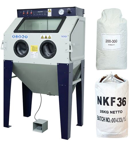 Sabbiatrice SOGI S-100 + sacco 25 kg di corindone grana 36 + 25 kg microsfere vetro grana 200/300