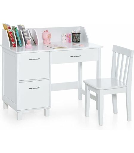 COSTWAY - Bureau Enfants avec Chaise Ergonomique & Niches, Table d'Étude en Bois avec 2 Placards & Tiroir, Dispositif Anti-Basculement, Table