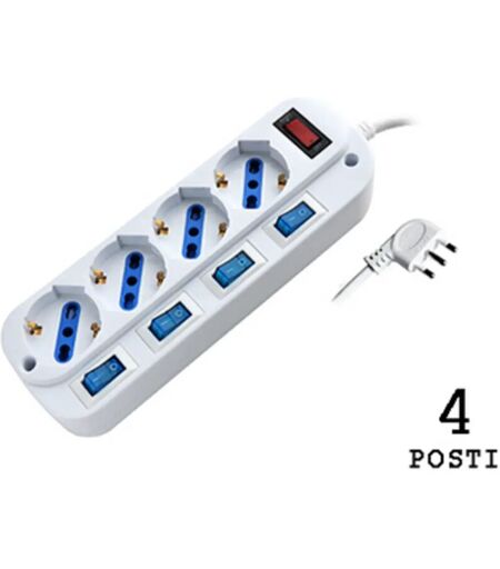 multipresa interruttore singolo spina piatta bianco 4 prese bipasso 10-16A Multipresa con foridi montaggio per attacco a parete interruttore luminoso generale con protezione da sovraccarico + interruttori indipendenti Spina salvaspazio a 90° In tecnopolimero autoestinguente per un'elevata sicurezza e resistenza meccanica. Alveoli protetti da contatti accidentali. spina piatta 16A tensione massima 250 volt potenza massima 3500 watt cavo H05VV-F 3G1.0mm2 x 1.5 metri ...