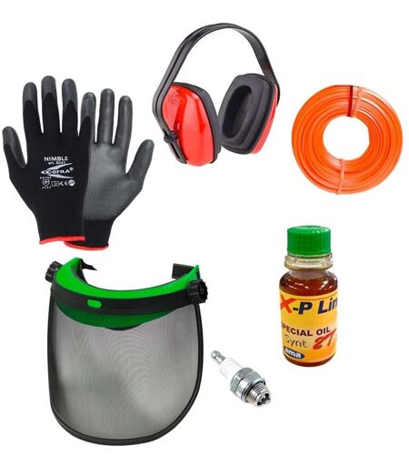 Il kit contiene il necessario per poter mettere in funzione il decespugliatore e l'occorrente per la regolare manutenzione.1 paio di guanti di manovra.1 pratico occhiale di sicurezza1 visiera retata1 cuffie antirumore2 flaconi di olio per miscela da 100 ml1 candela di ricambio1 bobina di filo di ricambio ...