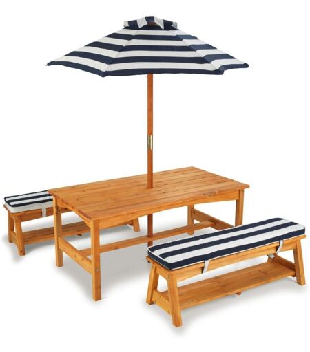 KIDKRAFT Set tavolo e panchine in legno per bambini con cuscini e ombrellone, mobili per giardino e per esterno, Strisce blu navy e bianche, 00106 -