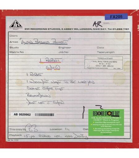 COOKING VINYL COOKLP841XXX 0711297534177 12 APR 2025 Questa versione Work In Progress dell'iconico album I Robot di The Alan Parsons Project contiene i primi mix grezzi e alternativi di dieci tracce di quell'album, tutte inedite e che quindi fanno la loro prima apparizione su vinile. Contenute in una custodia interna in poliammide con un inserto 12 x 12 contenente le note di copertina traccia per traccia di Alan Parsons, questo LP in vinile blu pesante da 180 g è rigorosamente limitato a 4100 copie in tutto il mondo. Tracklist 1 I ROBOT Early Mix Before Choir 2 I WOULDNT WANT TO BE LIKE YOU Early Mix Of Backing Track 3 SOME OTHER TIME Rough Mix Jaki Alt Lyric amp Ad Libs 4 BREAKDOWN Rough Mix With Extended Ending 5 DONT LET IT SHOW Rough Mix con partitura per orchestra alternativa e coda separata 6 THE VOICE Rough Mix con archi extra amp Alan Vocoder 7 NUCLEUS Projectron Solo 8 DAY AFTER DAY Base musicale 9 TOTAL ECLIPSE Solo coro 10 GENESIS CH1 V32 Everything But The Choir ...