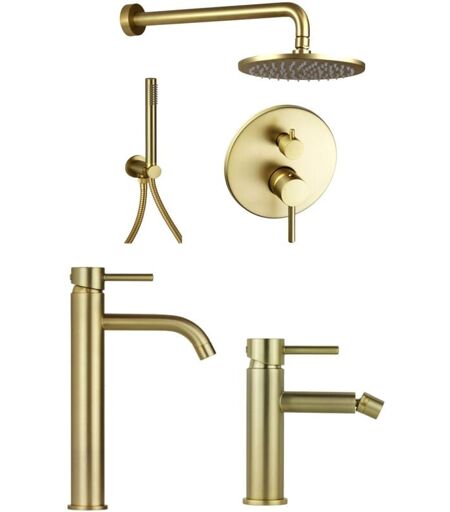 Set completo di miscelatore lavabo alto, miscelatore bidet e kit doccia completo in colore oro spazzolato Pollini Acqua Design Jessy KITJES4OS Questo set completo per bagno in colore oro spazzolato è composto da un miscelatore bocca alta per lavandini a bacinella, un miscelatore bidet e un kit doccia completo in colore oro spazzolato, la linea moderna si abbina facilmente ad ambienti bagno contemporanei. La colorazione oro spazzolato viene eseguita all'interno dell'azienda secondo gli standard di qualità ISO9001 CARATTERISTICHE miscelatore lavavo alto: Flessibili di collegamento Ø3/8" Gas inclusi Kit di fissaggio easyfix incluso Piletta di scarico modello clic-clac incluso Materiale: ottone CARATTERISTICHE miscelatore bidet: Flessibili di collegamento Ø3/8" Gas inclusi Kit di fissaggio Easy fix incluso Piletta di scarico modello clic-clac incluso Materiale: ottone CARATTERISTICHE set doccia: Soffione Ø200 mm in ottone Braccio 350 mm in ottone Corpo incasso incluso Installazione ...