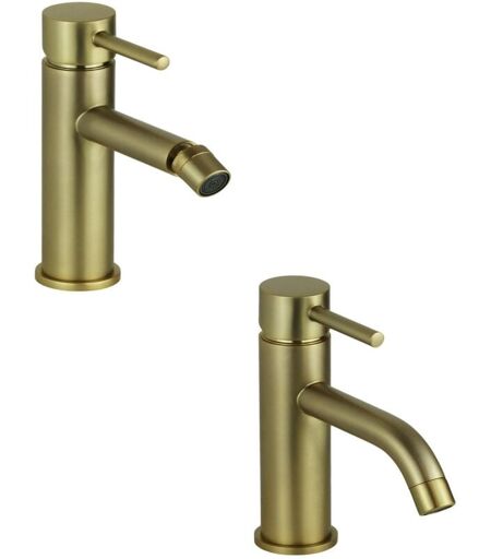 Pacchetto completo per bagno miscelatore per lavabo e bidet in colore oro spazzolato Pollini Acqua Design KITJES1OS Set bagno completo di miscelatore per lavabo e bidet completo di tutto il necessario per una corretta installazione, entrambe i prodotti vengono forniti completi di piletta di scarico modello clic-clac, flessibili di collegamento e kit di fissaggio. Prodotti realizzati in ottone di alta qualità, la colorazione oro spazzolato rende l'ambiente bagno moderno e minimale. CARATTERISTICHE: Marca: Pollini Acqua Design Serie: Jessy Flessibili di collegamento Ø3/8" Gas inclusi Kit di fissaggio easyfix incluso Piletta di scarico modello clic-clac inclusa Materiale: ottone Colore: oro spazzolato Codice prodotto: KITJES1OS L'azienda Pollini Acqua Design garantisce questo set completo per bagno 2 anni dalla data dell'acquisto, si raccomanda una pulizia senza l'utilizzo di sostanze corrosive Colore : Oro ...
