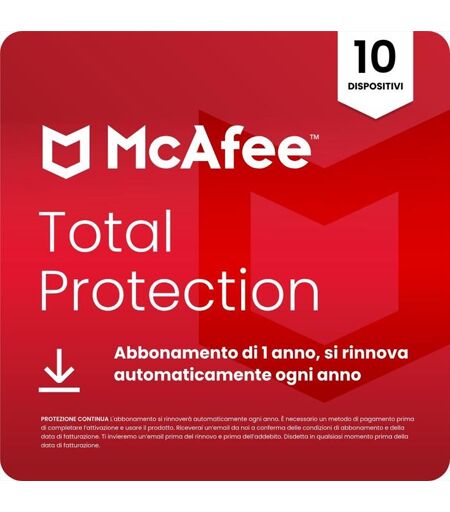 McAfee Total Protection: protezione indispensabile per i tuoi dispositivi. Nell'era digitale di oggi, la salvaguardia dei tuoi dati personali e della privacy online è fondamentale. Scegli McAfee Total Protection, la protezione essenziale che difende i tuoi dispositivi nel panorama delle minacce informatiche in continua evoluzione. Include il pluripremiato antivirus, la protezione dalle truffe, il monitoraggio dell'identità, la VPN sicura e il gestore di password. Protezione indispensabile contro virus e malware: McAfee Total Protection è la protezione indispensabile che lavora per tutelare i tuoi dispositivi dalle ultime minacce informatiche. Il suo antivirus pluripremiato, potenziato dalla tecnologia IA avanzata McAfee™, costituisce la tua prima linea di difesa contro virus, malware e altri software dannosi. Avrai la tranquillità di sapere che McAfee Total Protection è al tuo fianco, aggiornando costantemente le proprie definizioni dei virus per anticipare le minacce in continua evoluzione. Previeni le truffe con il rilevatore truffe tramite SMS potenziato dall'intelligenza artificiale di McAfee: questa tecnologia avanzata rileva e blocca i link rischiosi e gli SMS sospetti, impedendoti di essere vittima delle truffe. Monitoraggio dell'identità per proteggere i tuoi dati personali: McAfee Total Protection va oltre i tradizionali antivirus offrendo i servizi completi di monitoraggio dell'identità. Questa funzione monitora diligentemente i tuoi dati personali, avvisandoti tempestivamente di qualsiasi attività sospetta o violazione dei dati. Con McAfee Total Protection hai la tranquillità di sapere che la tua identità resta indenne e al sicuro. VPN sicura e illimitata: la VPN sicura cripta il tuo traffico Internet, aggiungendo un livello di protezione alle tue attività online. Questo è particolarmente importante quando si utilizzano le reti Wi-Fi pubbliche, in quanto nasconde i tuoi dati personali a occhi e orecchie indiscreti. Con la VPN sicura di McAfee Total Protection puoi navigare su Internet tranquillamente, sapendo che la tua riservatezza ha la priorità. ...