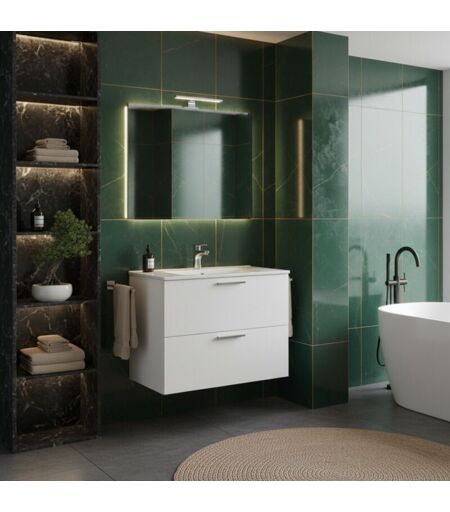 Mobile bagno sospeso 80 cm bianco con 2 cassetti incluso lavabo e specchio con luce - Mia Vitra Il mobile bagno sospeso Mia 80 cm di Vitra unisce stile contemporaneo, funzionalità e qualità costruttiva. La sua finitura bianco lucido e le linee pulite lo rendono ideale per arredare bagni moderni con eleganza e praticità. Il set è completo di lavabo in ceramica con troppopieno , specchio Flat con applique LED integrata e sifone incluso . La struttura è realizzata in chipboard rivestito in melaminico con uno spessore di 16 mm, mentre i due cassetti scorrono su guide Hettich softclose per una chiusura silenziosa e fluida. Caratteristiche principali: Marca: Vitra Serie: Mia Tipologia: mobile bagno sospeso Composizione: mobile + lavabo + specchio + applique LED + sifone Finitura: bianco lucido Materiale struttura: con rivestimento melaminico Spessore ante/corpo: 16 mm Installazione: sospesa Cassetti: 2 con chiusura rallentata (Hettich softclose) Specchio: Flat con applique LED integrata ...