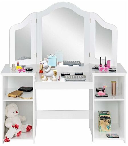 INFORMAZIONI Ottimo regalo per bambini: Questa toeletta è piccola e ideale per i bambini, spaziosa per giocare e ottima per migliorare le abilità manuali e l’immaginazione. Tutte le bambine vogliono una toeletta con gioielli e cosmetici! Allora comprala subito! Specchio rimovibile con 3 pannelli: Lo specchio con 3 pannelli è comodo per guardarsi anche da seduti. Inoltre, la parte superiore della toeletta può essere rimossa e la toeletta si trasforma in una scrivania. Questo design 2 in 1 è pratico e occupa poco spazio. Spaziosa: La toeletta ha una superficie spaziosa e 2 armadietti grandi con scompartimenti. Mantiene tutto in ordine e si possono conservare gioielli, cosmetici, libri, giocattoli e molto altro. Questo design abitua i bambini a sistemare le loro cose. Design sicuro e di alta qualità: La toeletta è realizzata con tavole di MDF di alta qualità, sicuro ed ecologico. Gli angoli arrotondati evitano che i bambini ci sbattano contro. Lo specchio è di plastica e non di vetro per ...