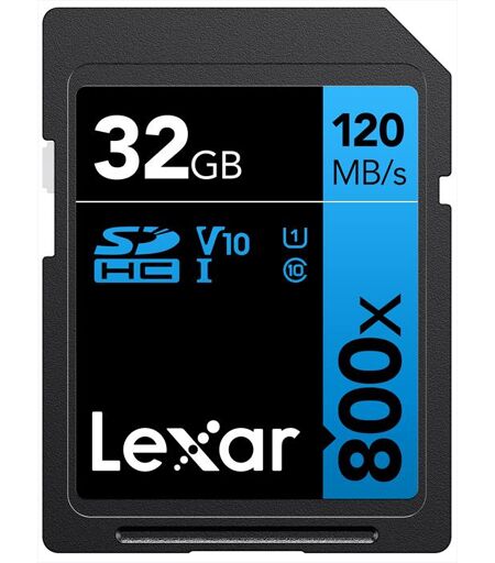 Supporto SDHC - Memoria 32 GB - Lettura di 120 Mb/sec - Scrittura 45 Mb/sec - Progettate per le fotocamere point-and-shoot, le reflex digitali di fascia media e le videocamere HD, le schede Lexar High-Performance 800x SDHC/SDXC UHS-I Serie BLUE consentono di acquisire e trasferire rapidamente foto di alta qualità e video Full-HD 1080p e 4K UHD2, con velocità di lettura fino a 120 MB/s. Queste schede di Classe 10 sfruttano la tecnologia UHS-I per offrire prestazioni ad alta velocità per le riprese di tutti i giorni. Le schede Lexar High-Performance 800x sono rigorosamente testate e progettate per essere resistenti all'acqua, alla temperatura, agli urti, alle vibrazioni e ai raggi X3. ...