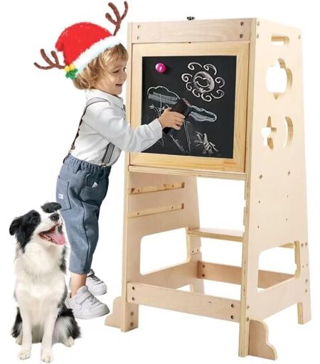 NECHE Torre di apprendimento per bambini, Baby Tower con 2 lavagne riscrivibili, Kitchen Aid, 3 altezze regolabili, barre di sicurezza, piedini in legno