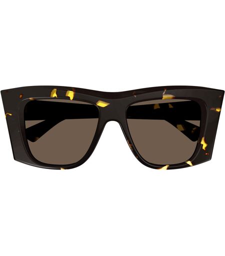 Ecco a voi gli Occhiali da sole Bottega Veneta New Classic Donna BV1270S 002. Montatura squadrata oversize e alla moda con un frontale più spesso nella parte superiore, creando uno spoiler che si fonde nella parte inferiore fino a formare l'iconica forma triangolare. Montatura havana su lenti marroni per un outfit elegante e unico. Frange metalliche sulle aste per un tocco tipico di Bottega Veneta. ...