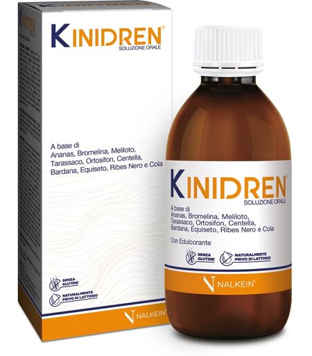 KINIDREN - Descrizione Soluzione orale è un complemento alimentare a base di ananas, bromelina, meliloto, tarassaco, ortosiphon, centella, bardana, equiseto, ribes nero e cola. L'ananas, il meliloto, l'equiseto, la bardana, la cola, l'ortosiphon ed il tarassaco, contribuiscono al drenaggio dei liqu… ...