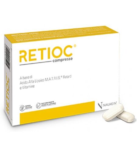RETIOC® - Descrizione RETIOC® compresse è un complemento alimentare a base di Acido Alfa Lipoico M.A.T.R.I.S.® Retard e Vitamine, indicato nei casi di ridotto apporto con la dieta o di aumentato fabbisogno di tali elementi. Le Vitamine B6, B12, C, la Tiamina, la Riboflavina e la Niacina, contribuis… ...
