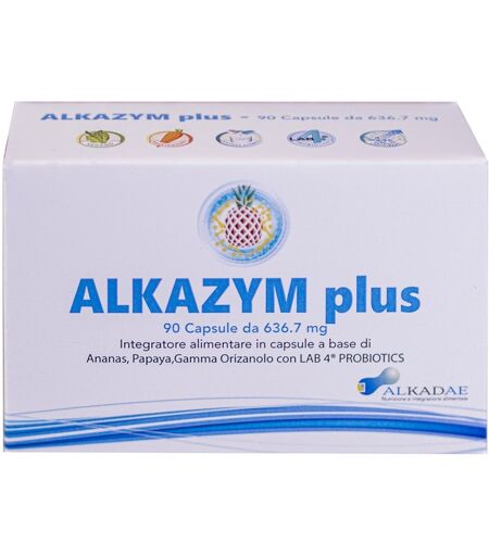 ALKAZYM PLUS - Descrizione Integratore alimentare in capsule a base di Ananas, Papaya, Gamma Orizanolo con LAB 4 PROBIOTICS. L'Ananas agisce favorevolmente sulla funzione digestiva. - Ingredienti Ananas concentrato (Ananas Comosus L. MERR) frutto, Gamma Orizanolo (Oryza Sativa L. semen), Papaya con… ...