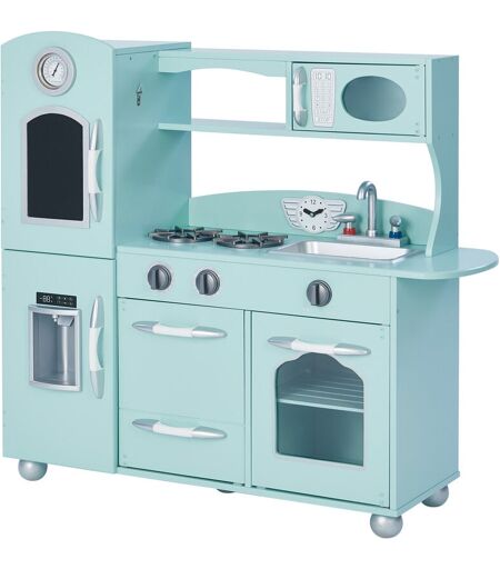 I tuoi piccoli chef adoreranno cucinare in questa cucina verde acqua retrň e contemporanea. Dai tre anni in su i bimbi amano fingere di usare frigorifero microonde fornelli forno e lavello. Un modello resistente con parti mobili che non mancherŕ di intrattenerli a lungo. Sapientemente realizzato in MDF ecologico (conforme CARB Phase 2) metallo e plastica. Il frigorifero ha due porte termometro e lavagna per gessetti. Č incluso un telefono cordless per stimolare l'immaginazione e favorire il gioco di ruolo. La cucina dispone di orologio giocattolo tre sportelli del forno due fornelli un lavello asportabile e tre manopole che girano e scattano. Grande per far giocare piů bambini contemporaneamente. Consigliato dai 3 anni in su ...