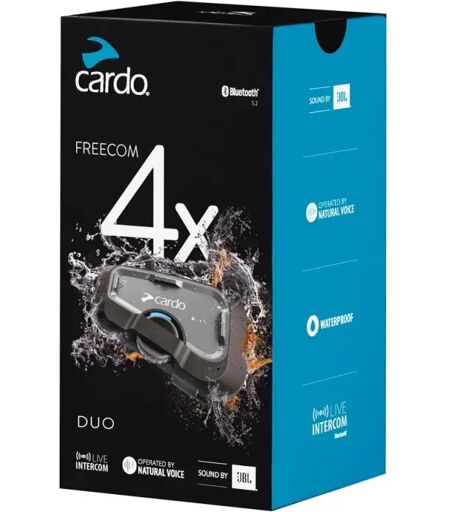 Interfono Doppio con audio JBL in grado di mettere in comunicazione quattro piloti fino a 1200 m di distanza Miglior sistema di comunicazione Bluetooth al mondo Tutto quello che hai sempre desiderato da un interfono di alta gamma per moto. Audio JBL, Live Intercom, fino a 4 motociclisti, funzionamento Natural Voice e un mucchio di altre incredibili funzionalità. LIVE INTERCOM Suono dal vivo, connessione in tempo reale. Prova l'eccezionale qualità audio con il nostro interfono Bluetooth con riconnesione automatica completamente nuovo. Per 4 motociclisti entro una portata di 1,2 km/0,75 mi. Portata di 1200m Fino a 4 motociclisti AUDIO JBL I potenti altoparlanti da 40 mm ad alta definizione, progettati alla perfezione dagli esperti JBL con un processore appositamente regolato e tre caratteristici profili audio, renderanno eccezionale la tua esperienza di guida della moto. RESISTENTE ALL'ACQUA Non importa cosa ci verserai sopra, il tuo FREECOM 4x resistente all'acqua reggerà il colpo e continuerà a farti stare connesso, sia con la pioggia, che con il sole, il fango, la polvere o la neve. GESTITO DA NATURAL VOICE Tieni gli occhi fissi sulla strada e le mani sul manubrio. Il nostro motore di funzionamento Natural Voice sempre attivo rende obsoleta la consuetudine di dover premere un pulsante. Basterà dire "Ehi, Cardo" e chiedere quello che desideri, il tuo FREECOM 4X farà il resto. AGGIORNAMENTI SOFTWARE OVER-THE-AIR Tenere aggiornata la tua unità non è mai stato così facile. Usa la tua app Cardo Connect per scaricare e installare l'ultima versione del software direttamente sul tuo Freecom 4x, senza bisogno di cavi. Radio FM La radio FM integrata con standard RDS consente la selezione automatica del segnale più forte, sia in città che nei posti isolati. Connettività universale Si connette con tutti gli auricolari Bluetooth di qualsiasi marca. Trasmissione della musica Tutta la musica che hai sempre voluto, trasmessa direttamente dal tuo smartphone. Controlla, condividi e ascolta il tuo brano preferito quando sei in viaggio. Telefono e GPS Effettua chiamate e controlla il GPS con il tocco di un dito o il suono della tua voce. Ricarica rapida Batteria scarica? 2 ore di tempo di conversazione dopo soli 20 minuti di ricarica. USB di tipo C USB di tipo C solido e universale, per connessioni facili con qualsiasi dispositivo. Ruota di controllo Comodità e controllo extra, tutto in una piccola ruota. Generali Compatibilità: Universale Temperatura di funzionamento -20?C to 55?C / -4? F to 131 ? F Resistente all'acqua Radio FM Frequenze operative: 76-108 MHz RDS - Radio Data systems Memorizzazione di 6 stazioni preimpostate Aggiornamenti del software Aggiornamenti over-the-air Aggiornamenti con cavo USB Impostazioni del dispositivo App Cardo Connect Dimensioni Unità principale Altezza: 48 mm - Lunghezza: 78 mm Profondità: 20 mm - Peso: 37 g Altoparlanti Diametro: 40 mm - Profondità: 10 mm Connettività 2 canali per cellulare e GPS Bluetooth 5.2... ...