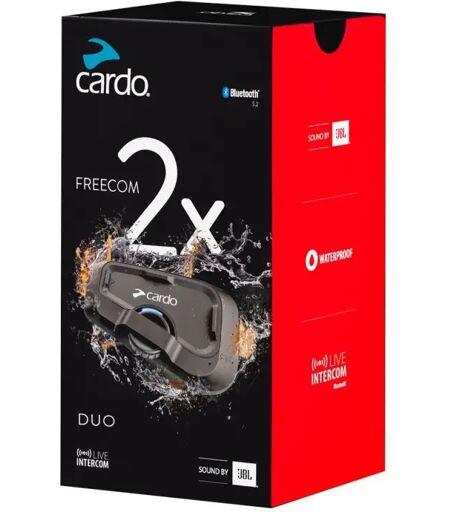 Interfono doppio con audio JBL in grado di mettere in comunicazione due piloti fino a 800 m di distanza Miglior sistema di comunicazione Bluetooth al mondo Grazie a Sound by JBL e alla più recente tecnologia Bluetooth, Freecom 2x presenta Live Intercom, un collegamento Bluetooth con riconnessione automatica per due motociclisti, con suoni dal vivo come mai sentiti prima d'ora. Resistenza all'acqua, jog-dial e aggiornamenti software over-the-air offrono un valore aggiunto a un pacchetto già incredibile. LIVE INTERCOM Suono dal vivo, connessione in tempo reale. Prova l'eccezionale qualità audio con il nostro Live Intercom Bluetooth con riconnesione automatica completamente nuovo. Per 2 motociclisti entro una portata di 800 m/0,5 mi. AUDIO JBL I potenti altoparlanti da 40 mm ad alta definizione, progettati alla perfezione dagli esperti JBL con un processore appositamente regolato e tre caratteristici profili audio, renderanno eccezionale la tua esperienza di guida della moto. RESISTENTE ALL'ACQUA Non importa cosa ci verserai sopra, il tuo FREECOM 2X resistente all'acqua reggerà il colpo e continuerà a farti stare connesso, sia con la pioggia, che con il sole, il fango, la polvere o la neve. AGGIORNAMENTI SOFTWARE OVER-THE-AIR Tenere aggiornata la tua unità non è mai stato così facile. Usa la tua app Cardo Connect per scaricare e installare l'ultima versione del software direttamente sul tuo Freecom 2x, senza bisogno di cavi. Radio FM La radio FM integrata con standard RDS consente la selezione automatica del segnale più forte, sia in città che nei posti isolati. Connettività universale Si connette con tutti gli auricolari Bluetooth di qualsiasi marca. Trasmissione della musica Tutta la musica che hai sempre voluto, trasmessa direttamente dal tuo smartphone. Controlla, condividi e ascolta il tuo brano preferito quando sei in viaggio. Telefono e GPS Effettua chiamate e controlla il GPS con il tocco di un dito o il suono della tua voce. Ricarica rapida Batteria scarica? 2 ore di tempo di conversazione dopo soli 20 minuti di ricarica. USB di tipo C USB di tipo C solido e universale, per connessioni facili con qualsiasi dispositivo. Ruota di controllo Comodità e controllo extra, tutto in una piccola ruota. Generali Compatibilità: Universale Temperatura di funzionamento -20?C to 55?C / -4? F to 131 ? F Resistente all'acqua Radio FM Frequenze operative: 76-108 MHz RDS - Radio Data systems Memorizzazione di 6 stazioni preimpostate Aggiornamenti del software Aggiornamenti over-the-air Aggiornamenti con cavo USB Impostazioni del dispositivo App Cardo Connect Dimensioni Unità principale Altezza: 48 mm - Lunghezza: 78 mm Profondità: 20 mm - Peso: 37 g Altoparlanti Diametro: 40 mm - Profondità: 10 mm Connettività 2 canali per cellulare e GPS Bluetooth 5.2 Connettività universale Connettività TFT Interfono Interfono Bluetooth con audio HD e riconnessione automatica Interfono Bluetooth universale Dimensioni del gruppo: fino a 2 motociclisti Portata: fino a 800 m/0... ...