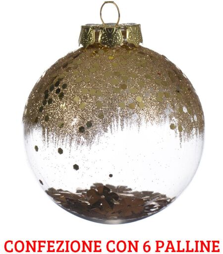PERAGASHOP 6 Palline Trasparenti Con Fiori E Lustrini Oro 8 Cm Addobbi Natalizi