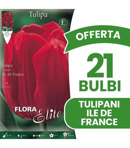 Tulipani Triumph Ile De France precoci, dai fiori corti e robusti, resistenti alle intemperie. Sono originari dell'Asia centrale. Fioriscono in aprile e maggio e sono ideali per il giardino, la terrazza e il balcone. Semina: piantali tra settembre e dicembre a 10 cm di profondità e a 5 cm di distanza l\'uno dall\'altro.Conservare in luogo ventilato e asciutto prima di piantarli. Caratteristiche dei bulbi: 21 bulbi calibro 11/12 Da naturalizzare in vaso Colore: rosso Mese Piantagione: 9-10-11-12 Mese Fioritura: 4-5 Altezza 50 cm Luce: Sole Profumo: No Recidere: Si. ...