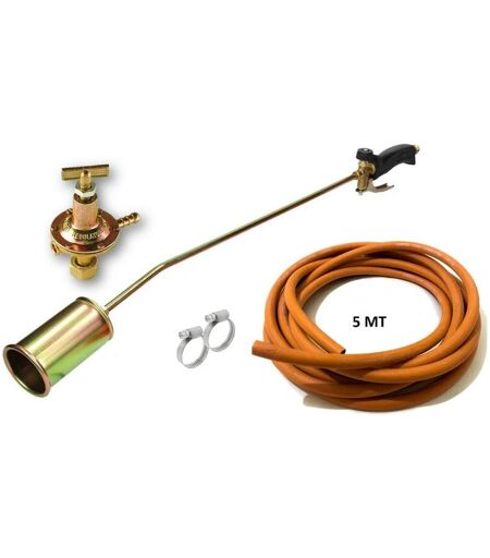 Kit Cannello con impugnatura fiamma regolabile con comando rapido prolunga 400mm e becco diametro 60mm. Spezzone 5mt di tubo gomma arancio pressione max. 20bar e regolatore 8kg/h taratura variabile 0÷4Bar con portagomma.(completo di fascette per il fissaggio) ...