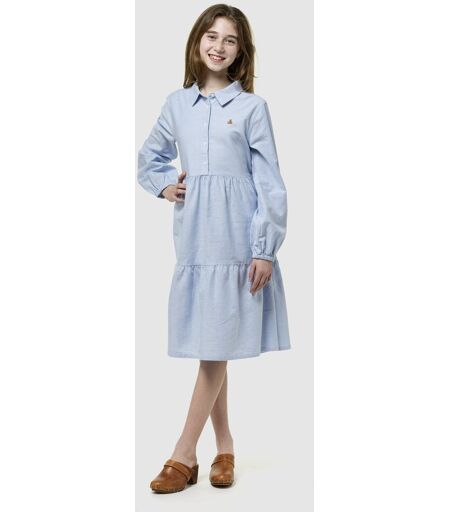 Vestito azzurro in cotone elasticizzato con design lungo a balze. Con maniche lunghe e chiusura con bottoni sul davanti. ...