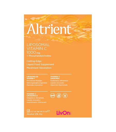 Altrient - LIPOSOMAL VITAMIN C - Descrizione Integratore alimentare a base di vitamina C liposomiale. Ingredienti Acqua purificata, fosfolipidi di lecitina (soia), ascorbato sodico (vitamina C); conservante: alcool di grano (etanolo); correttore di acidità: acido citrico. - Contiene derivati dalla … ...