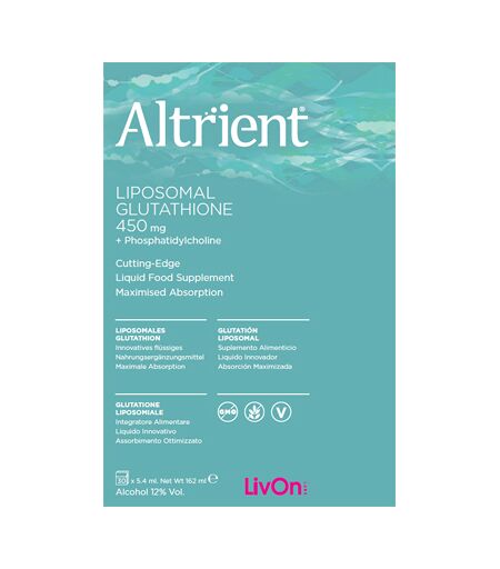 Altrient - LIPOSOMAL GLUTATHIONE - Descrizione Integratore alimentare a base di glutatione liposomiale. Ingredienti Setria glutatione (forma ridotta), fosfolipidi (lecitina di soia), acqua deionizzata; conservante: alcool di grano (etanolo); correttore di acidità: idrossido di potassio. Contiene de… ...