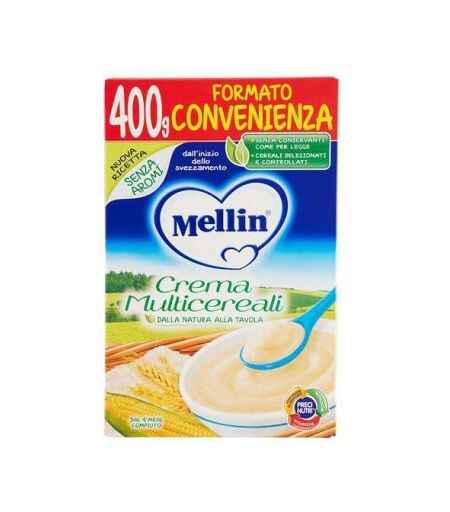Le creme di cereali sono tra i primi alimenti che vengono introdotti nella dieta del bambino per iniziare ad abituarlo delicatamente ai primi cibi solidi, sentito il parere del Pediatra. Per variare il gusto della pappa del tuo bambino puoi alternare creme di varie tipologie di cereali, come riso, mais e la tapioca, semolino e multicereali, dopo aver sentito il parere del Pediatra. Mellin ha sviluppato PRECINUTRI, l'esclusivo Programma di PRECIsione NUTRIzionale per rispondere alle sue esigenze specifiche attraverso prodotti sicuri, nutrizionalmente corretti e che aiutino ad educarlo a buone abitudini alimentari. Senza aromi;cereali idrolizzati; ingredienti selezionati e rigorosamente controllati. Ingredienti:Farina di cereali (frumento idrolizzato 40,4%, frumento 38%, riso 12%, mais 79%, orzo integrale 1%, avena integrale 1% ), antiossidante: acido ascorbico, vitamina B1. Contiene glutine. Puo' contenere tracce di latte e soia.Crema Multicereali indicata dal 4o al 36o mese salvo diverso parere del Pediatra. ...